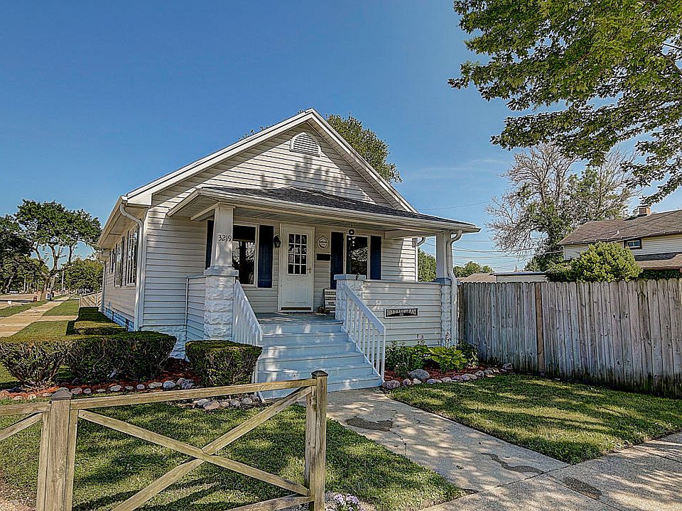 Don't miss this charming bungalow with an extra large fenced yard and patio! Spacious carpeted living room flows into attached dining area featuring HWF. Historical touches include 5 panel Shaker-style doors and wide baseboards. Updated bathroom with ceramic tile, soaker tub, newer vanity, and lighting, Loads of storage: plenty of kitchen cabinetry, huge pantry, & mud room off rear entry. Lower level currently used as playroom and music studio. Dry basement is just waiting for your finishing touches! Newer windows, low maintenance siding, and large front porch make for easy living! 3 car heated garage for car enthusiasts, or anyone wanting the extra space! Great location that is walkable to grocery store, the lake, and the Racine zoo. AC: 2018, H20 Heater: 3-4 years old.