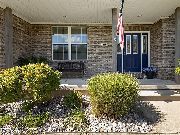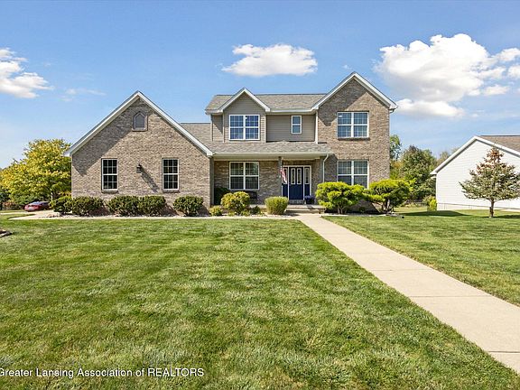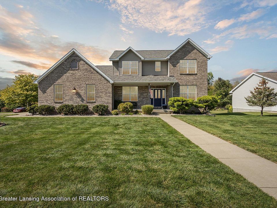 Beautiful brick-front home in Delta Township! Lots of flexible space and bedroom suites! You'll notice right away the corner landscaped lot and sideload garage. Enter the home through the front porch to a foyer with wood floors and 9-foot ceilings that are throughout the main floor. To the right is a cozy living room with gas fireplace; to the left is a formal dining room. The kitchen is open to a large family room and breakfast nook and features white cabinets, granite counters, stainless steel appliances, double sink and large pantry. A first-floor laundry and powder room are off the garage entrance. Upstairs are all the bedrooms. The primary suite features crown molding, walk-in closet and en-suite with dual sink vanity and tiled shower. There is a jack-and-jill suite with separated bathroom - two single vanities and storage plus private tub/shower and toilet. Lastly, there is another bedroom suite with its own private bathroom. The walk-out basement is ready to finish with its 9-foot ceilings, lots of natural light, storage and has been plumbed for an additional bath. A nicely fenced yard includes an expansive deck with gazebo and storage shed. The oversized garage is finished and has tons of storage. Other features include new roof in July 2025, sprinkler system and back-up generator.