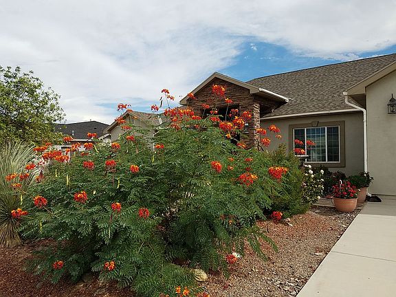 Shown by appointment only. Compliant with Covid19 guildlines. Beautiful, well maintained, energy efficient ONE- OWNER home in desirable location. Many upgrades throughout: Spacious split floor plan, to-die-for kitchen with 3 lower turn tables, pantry, 18" porcelain tile floors, gorgeous tile work in baths, granite throughout, 2-sided gas fireplace, built-in surround sound in great room AND on the patio! Instant hot water, huge master suite, large office/den/2nd family room. Upgraded lighting throughout, ceiling fans in every room. Storage! Storage! Large linen closet(s), master and one guest room have walk-in closet and the other two guest rooms have really nice organizer closets. Beautifully landscaped on timed drip, garden area, fruit trees and, a huge shade tree in back yard. Block privacy fence, wonderful back porch that you can enjoy all year, mountain views. Storage room on back porch and an additional 8X11 storage/garden shed. Extra deep garage w/work bench. Open to offers