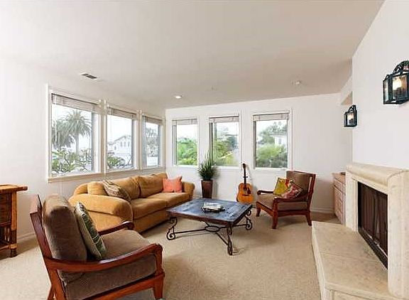 Awesome beach Villa in ideal location two blocks from Moonlight Beach. Spacious with limestone flooring high ceilings filled with light and glass. Four bedrooms 3 full baths in over 3200 square feet. 3 decks including rooftop hideaway as well as a patio for barbequing and entertaining. Master suite is 500 sq ft with fireplace and ocean view deck. Full bedroom and bath on entry level and 3 car garage Ideal for extended family retreat vacation rental or family home. Home could benefit from updating