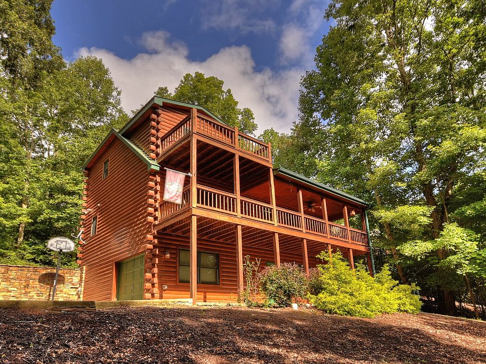 First time on the market! 3BR/3BA cabin with LAKE FRONTAGE & LAKE VIEW on quiet cove of LAKE NOTTELY, includes all aluminum DOCK w/wide slip & jet ski ramp. All paved roads, nice neighborhood, underground utilities, basement garage, plentiful parking. Easy walkway to lake, rock firepit on water's edge and all natural landscaping. Cabin features great room with rock fireplace (gas logs), area for dining, there's a bedroom and bath on each level plus a bunk room (this cabin sleeps 8 to 10 easy). Master on upper level w/private balcony (perfect for morning coffee). Finished basement includes den area, guest suite & large laundry. Full length covered porch and ground level patio provide outdoor areas for grillin' & chillin'. Perfect mountain cabin for full time living or vacation home. (This property has never been in the vacation rental program but it will make a great rental.)