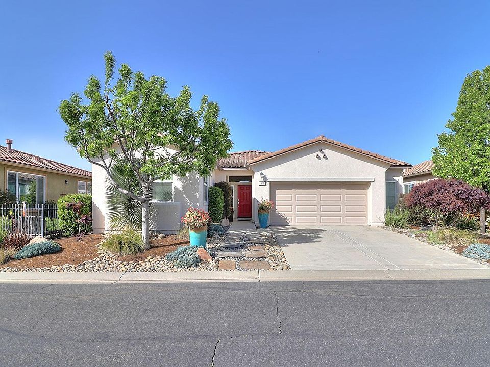 This attractive solar powered Hillsborough enjoys beautiful upgraded interiors on a gorgeously landscaped lot with a lush, private, garden-like back yard with covered patio, and rock garden with fountain. Features include Emser brand jumbo tile flooring in all but the beds that looks like genuine slate stone but is easy to maintain and very durable. Other features include cherry-stained cabinetry throughout, Hunter-Douglas honeycomb blinds with black-out shades in the primary bed and wide slat blinds in the guest bed, a charming right-angled fireplace in the great room with rustic stone surround, upgraded carpeting and pads in the beds, and a 2.5 car expanded garage. The open kitchen boasts a huge central island, solid-slab granite countertops, under cabinet lighting, and sleek stainless-steel appliances including a large French door refrigerator. The primary bed enjoys a nice bay window, a big dual sink vanity, a roomy shower with bench seating, and a large walk-in closet. Relax outdoors on the comfortable fully covered patio with an open-air extension surrounded by lush vine covered trellises, rock gardens, flagstone walkways, and colorful flower beds. Home includes whole-home water softener and fire suppression systems, and RO drinking water system. Trilogy is a 55+ community