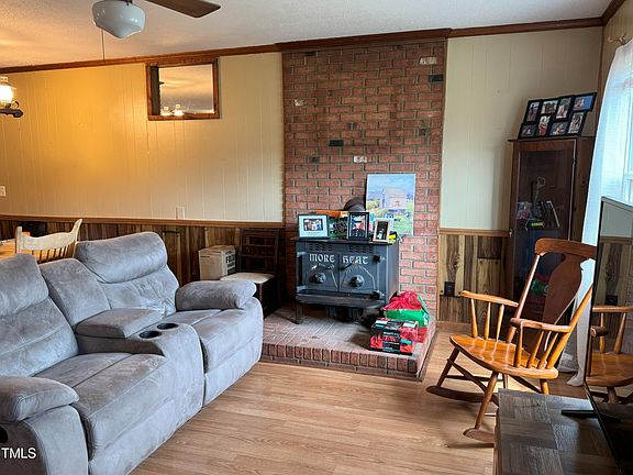 This inviting ranch-style home is situated on a large country lot and offers a peaceful retreat. The open floor plan seamlessly connects the kitchen and living room, where you'll find a wood-burning stove perfect for chilly nights, to the rest of the home. A large sunroom is a standout feature, offering both heating and cooling for year-round comfort. The home also boasts a durable tin roof and a fenced front yard. Outside, you'll find several storage buildings for added convenience, plus a metal building with power—ideal for workshops or additional storage. Perfect for those seeking a country lifestyle!