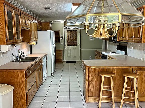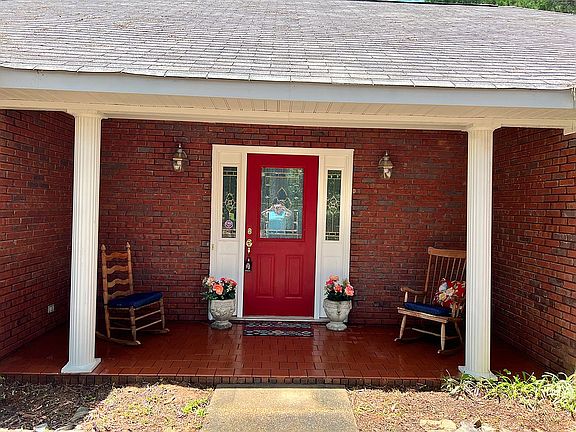Custom Home. Great room-trey ceiling,large fireplace with blowers, fan, carpet,spot light. Master bedroom-Trey ceiling, laminate wood floorings, crown molding,walk in closet. Garden tub, large separate shower, two basin,tile flooring, framed mirror. Bedrooms 2 counter with bottom cabinets, hook up for washer and dryer connections, tile floor. Kitchen -oak cabinets, spot lights, slide in stove(elec.), double sink, double glass cabinet, pantry, bar with two stools, desk is separate. Foyer has wood flooring. Sun room, 12 glassed insulated windows, fan, insulted, a/c, tile floor, vinyl ceiling. 17x30 workshop with attached shed Large two-car garage with four large storage cabinets and remote control. Second bath, large window, framed mirror, large vanity with one basin,full tub w/shower, tile room. New AC system installed June 2021.
