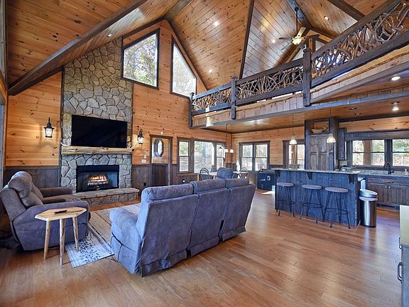 This spacious fully furnished modern rustic cabin is a true gem. Even from the approach you and your fur babies feel at home. The gated community of South Toccoa Estates is located minutes from McCaysville and Downtown Blue Ridge. The interior boasts a perfect blend of sheetrock, light and dark-toned wood finishes, high ceilings, and 4 stone fireplaces. The incredible vistas from numerous rooms are breathtaking as well as relaxing - spacious mountain and lush valleys creating an inviting atmosphere for all. With a covered screen porch, you can enjoy the beauty of nature while being protected from the elements. Enjoy the Natural Stone fireplace with mountain views while the pets enjoy their very own fenced-in yard below. The porch includes a large dining space along with cozy seating by the roaring fire on chilly evenings. The Multi-level bedrooms w/ 3.5 bath cabin offer a unique combination of organic materials throughout. The main and upstairs bedrooms can serve as master bedrooms. The one on the upstairs has its own fireplace and balcony. Give the young at heart free range in the basement equipped with a pool table, shuffleboard, TV, and bar. Along with a large bedroom, there can be room for additional sleeping. Multi-level zoned HVAC and hookups for w/d on two separate levels. Make this dream retreat your peaceful getaway. The community is located near trophy trout waters on the Toccoa River with deeded river access..
