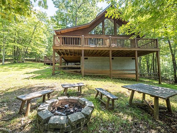 Tucked away on almost an acre and a half of bliss, this pretty little 2 bedroom, 2 bathroom cabin in the woods is waiting for you. As you approach via the paved driveway, you'll be greeted by a meticulously maintained property with both a spacious parking area and an inviting front porch. The porch extends into a generous deck, ideal for relaxing and taking in the seasonal views that, with some tree clearing, could become even more expansive. Step inside to discover the bright and airy Great Room, where light floods through the signature chalet windows, creating a warm and welcoming atmosphere. The rich wood floors flow seamlessly throughout the entire home, adding to the cozy, cabin-like feel. A stone gas fireplace anchors the space, while the vaulted ceiling enhances the room's open and airy ambiance. The double sliding glass doors provide easy access to the deck, where you can unwind amidst the peaceful surroundings. The Great Room opens to a well-appointed kitchen, designed with ample counter space for meal prep and entertaining. Also on the main level, you'll find a comfortable guest bedroom with a walk-in closet, providing plenty of storage space. Adjacent to the bedroom is a guest bathroom, along with a conveniently located laundry area, ensuring everything you need is within easy reach. Upstairs in the loft, the Master Suite awaits. This private retreat features a spacious bedroom with an en-suite bathroom and a large walk-in closet. The loft's elevated position allows for views of the surrounding woods, creating a peaceful haven at the end of the day. Outside, the fire pit offers the perfect spot to enjoy evenings under the stars. Whether you're roasting marshmallows or simply relaxing by the fire, this outdoor space adds to the charm of this idyllic chalet. Fiber optic internet, too! Come home today!