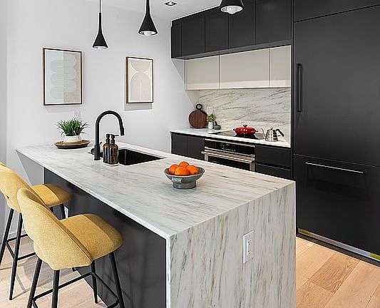 Calacatta marble waterfall countertops and backsplash