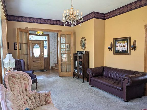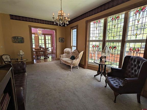 This is a classic Ouray victorian located right on main street and is full of character and charm. The current owners completely renovated the house in 1987 to become a popular bed and breakfast that they ran for 16 years. The family has used it as a summer residence since 2000. When you enter the home you are greeted by the beautiful oak staircase, hardwood floors, and solid custom oak trim that continues throughout the house. The living room has tall ceilings and gorgeous 150 year old stained glass windows from England. It opens up to the dining room which is very light and bright with four large south facing windows and two sets of french doors leading to the back deck. The kitchen has granite countertops, solid oak cabinets, a double oven and gas range. Laundry is located on the main floor off the hallway to the first bedroom. This bedroom has a three quarter bathroom, tall ceilings and a bay window looking out to the covered front porch and main street. Upstairs hosts the primary suite and second guest bedroom. The guest bedroom has a full bathroom, closet and a balcony that is shared with the primary suite that overlooks the Amphitheatre, Gold Hill, down the valley and down main street into downtown. The primary suite has a walk in closet, full bathroom and seating area that leads out to the balcony that is shared with the guest bedroom. On the other side of the suite you have a private deck with amazing views of mount Hayden, Weehawken, White House, Twin Peaks and Sister Peak. The house sits on two city lots which allows for a larger fenced back yard, side yard and parking off the alley for 3 or more cars. The back deck spans the length of the back yard and is private with a charming gazebo and truly stunning views. There is covered storage/ work area under the deck as well as a large unfinished basement. This property is priced to sell so come see it soon!