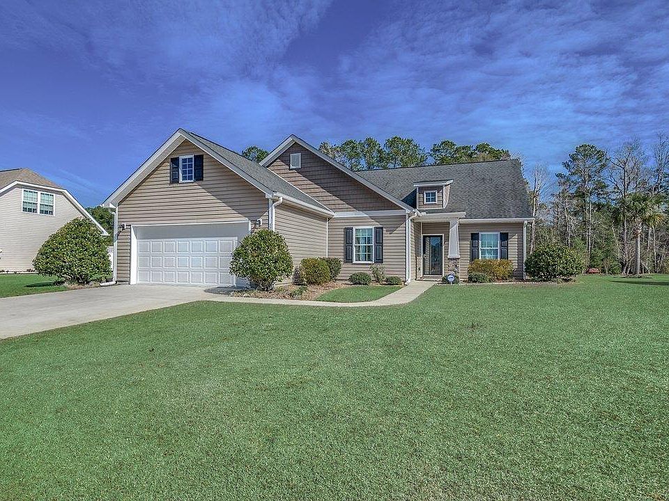 Beautifully maintained Welbourne model home has 4 bedrooms, 3 baths, 2 car garage and sits on nearly acre with a rear tree line for additional privacy. This home boasts an open floor plan, tons of sunlight with 3 bedrooms/2 baths on the main level and 1 bedroom/1 bath upstairs. The large eat-in kitchen features tons of granite counterspace, a work island, plenty of cabinets, stainless steel appliances including a gas stove and a new French door refrigerator (2021), undermount sink with new garbage disposal (2019), breakfast bar and nook, and a walk-in pantry. Formal dining room. The huge family room has recessed lighting, 2 floor outlets, and a gas log fireplace. Pristine hardwood floors are throughout the living areas of the 1st floor while bathrooms and laundry are tiled, and bedrooms have carpet. Ceiling fans are in dining room, living room, owners bedroom and upstairs bedroom. The main level 227x154 owners suite has tray ceilings, a huge walk-in closet, a sitting area, linen closet, double sinks, soaking tub, separate shower and a private water closet. There are 2 additional guest bedrooms on the main level and 1 large guest bath with tub/shower combo. Upstairs is the 4th bedroom and 3rd full bath with a shower along with separate thermostat. The 1st floor laundry room has a side-by-side washer & dryer (convey) with overhead shelving. The attached 2 car garage contains a few items that will convey if wanted: refrigerator, lawn mower, wagon, beach umbrella with anchor and beach buggie. Buried propane tank is leased through Suburban Propane and powers the stove, fireplace and tankless water heater. Enjoy the spacious 189x133 screened porch with 2 ceiling fans, cable outlet and beautiful, relaxing views of the tree-lined, fully fenced back yard. Entertain and grill on the huge 626 sqft concrete patio surrounding the screened porch. The property line goes beyond the fence almost to the trees. The 4 black aluminum fence has 3 gates. Irrigation is all around house but does not go all the way back to the fence. 3 motion sensor flood lights outside. Gutters along the back of the house. The reasonable HOA fees include trash pickup, common area maintenance and property management. Owners are allowed motorcycles, golf carts and pets. Come see this wonderful home located outside all the city hustle and bustle yet within 20 minutes of all North Myrtle Beach has to offer: shopping, entertainment, shag dance clubs, restaurants and of course the sandy beach!