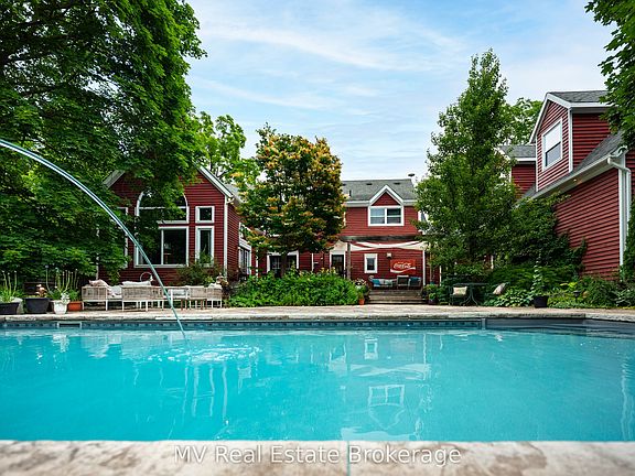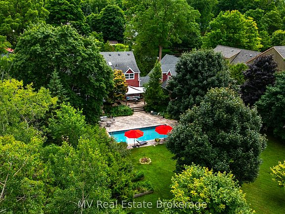 Discover one of Elora's best-kept secrets - an exclusive street with only six homes, tucked away in a quiet and private setting, yet just minutes to downtown. This exceptional property with mature trees and a forest at the rear offers a rare blend of space, character, and natural beauty, set on over an acre overlooking the river gorge. The completely fenced backyard is ideal for children and pets, with an in-ground pool, courtyard, stone wall, and numerous private sitting areas to enjoy.The large 4-bedroom home has evolved beautifully over time - carefully renovated and expanded creating multiple living areas to suit todays lifestyle. Highlights include a great room with soaring 18' ceilings and a wood-burning fireplace, gorgeous wide soft pine plank flooring, and a family room with gas fireplace that could easily convert to a main-floor bedroom with ensuite potential. A one-bedroom in-law suite offers flexibility for extended family or guests.Outdoors, a detached 20' x 40' barn sits at the rear of the property, perfect for storage, hobbies, or workshop space. The 4-car garage with 12' ceilings and driveway parking for 15 ensures plenty of room for vehicles and toys.Families will appreciate the proximity to highly regarded Salem Public School - a key reason the current owners chose this location years ago. This is more than a home - it's a lifestyle, offering privacy, natural beauty, and the warmth of a unique residence in one of Elora's most desirable and little-known settings.