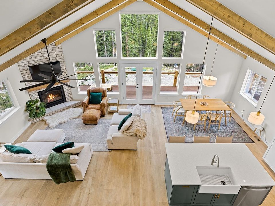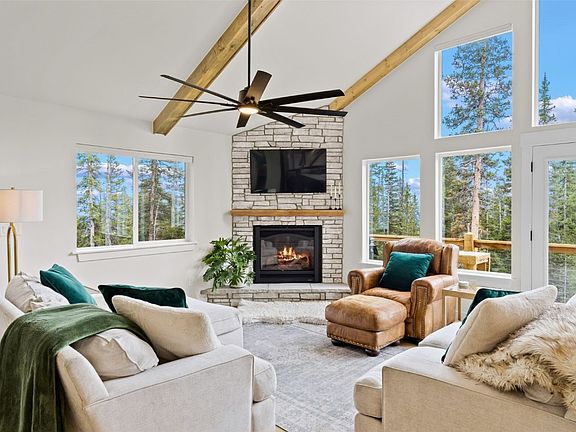 Built in 2023, this modern mountain retreat blends style, comfort, and functionality with quality finishes throughout. The open-concept great room welcomes you with soaring ceilings, exposed beams, and a stunning stone gas fireplace. A wall of windows fills the home with natural light and captures views of the surrounding forest.