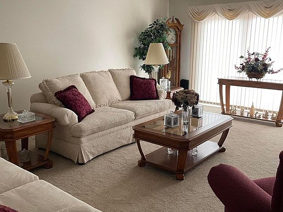 3 large bdrms, 3 baths, eat-in kitchen plus formal dining room, vaulted ceilings, 2 electric fireplaces, steel siding, newer roof, extra wide patio door opens to green space with sprinkler system.Home warranty included.*Taxes are discounted