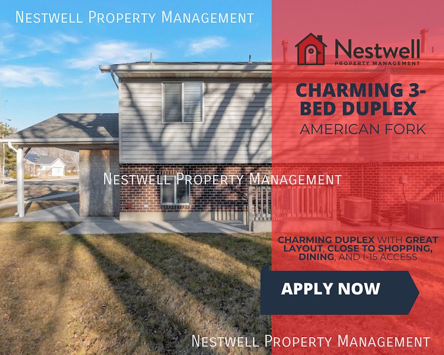 Discover the inviting charm of this delightful duplex, featuring an excellent floor plan. Enjoy its convenient proximity to shopping, dining, and seamless access to I-15. Schedule your Showing Appt. ONLINE NOW! AVAILABLE DATE: NOW! LEASE LENGTH: 12 Months OCCUPANCY RULE: No More than 3 unrelated adult occupants TYPE: Duplex SQUARE FEET: 1250/1250 GARAGE: Carport & Driveway FENCED YARD: Partially Fenced FEATURES: - 3 Bedrooms - 1.5 Bathrooms - Granite Countertops - Staggered Cabinets - Stainless Steel Appliances - Pantry - Family Room - Double Closets - Washer/Dryer Hookups - Shed - And more... TENANT CHARGES: - Resident to sign/pay for gas & electricity - Resident to pay water, sewer, and garbage monthly - Resident to pay $95.00 CAM Fee per month - Resident Benefits Package (RBP) = $34.95 per month *For information on this service - Property Damage Liability Waiver For Residents (PDLW) = $15.95 per month.**For - Security Deposit = Same as rent depending on application score (fully refundable) - Application Fee = $40.00 per applicant 18 and older - Lease Initiation Fee = $150.00 after approval and upon signing - Pet fees as listed (if applicable) - If the mailbox is a community box that requires a key, it is owned by the Postal Service. A small fee may be required to get mailbox keys upon move-in. YARD CARE: CAM Fee Weekly yard service provided. Tenants responsible for snow removal. PETS: No Pets are permitted in or on the property. NO Smoking or Vaping is permitted in or on the property. SHOWING INSTRUCTIONS: TO APPLY: - $40.00 application fee per adult to be paid at the time of application. - All applicants will be required to fill out an animal profile even if you do not have a pet. The link will be provided after you have submitted your application and paid the fee. - We process all applications, and the first application that completes all the paperwork requirements will be processed first. PROPERTY MANAGER: CDA/Nestwell Property Mgmt. 8813 S Redwood Road #D1 West Jordan, UT 84088 * All information is deemed reliable but not guaranteed and is subject to change. Animals (Friendly) Assigned Covered Parking Cooling (Central Air) Covered Carport/Parking Disposal Floors (Carpet) Floors (Laminate/Lvp) I 15 Access New Flooring New Paint Shed/Out Building Smoking (Not Allowed) Washer/Dryer Hookups Yard (Not Fenced) TENANT CHARGES: - Resident to sign/pay for gas & electricity - Resident to pay water, sewer, and garbage monthly - Resident to pay $95.00 CAM Fee per month - Resident Benefits Package (RBP) = $34.95 per month *For information on this service - Property Damage Liability Waiver For Residents (PDLW) = $15.95 per month.**For - Security Deposit = Same as rent depending on application score (fully refundable) - Application Fee = $40.00 per applicant 18 and older - Lease Initiation Fee = $150.00 after approval and upon signing - Pet fees as listed (if applicable) - If the mailbox is a community box that requires a key, it is owned by the Postal Service. A small fee may be required to get mailbox keys upon move-in. YARD CARE: CAM Fee Weekly yard service provided. Tenants responsible for snow removal. PETS: No Pets are permitted in or on the property. NO Smoking or Vaping is permitted in or on the property.