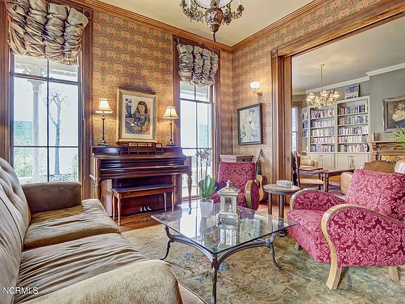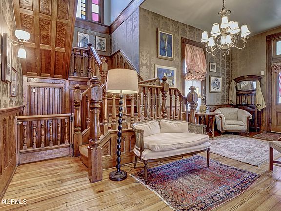 Presenting the Durham-Davis House. This beautiful Queen Anne Victorian, built in 1890, is located on a large lot in the historic district. A beautiful renovation in 2006 included the addition of kitchen space with custom cabinetry, limestone countertops, high end appliances and many custom features. Also added was a nice laundry room and 20 x 10 screened porch looking over a lovely yard that includes an outdoor grilling area and pizza oven. There is a 2 car detached garage. The photos show the elegance and beautiful details of this home, including 9 fireplaces, 10 foot ceilings, built-in cabinetry. See attached list of house features.