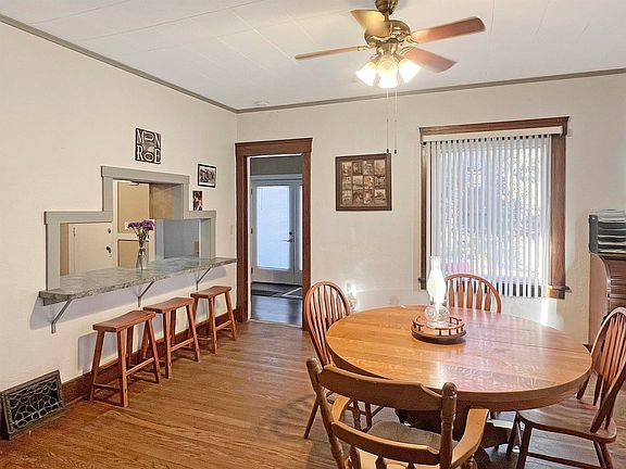 Welcome to this classic 3-bedroom, 1-full bath home with endless character and modern updates! As you step inside, you’ll immediately be drawn to the spacious living room featuring wood burning fireplace and hardwood floors found throughout the home. The living room effortlessly connects to the dining room, which boasts lovely built-ins, perfect for added storage and display. The breakfast bar adds convenience for ideal for casual meals or entertaining guests. The expansive 25' front porch adds curb appeal and provides the perfect spot for outdoor lounging. in addition to the 3 bedrooms and large extra walk in closet upstairs, home also includes a versatile bonus room that can be used as an office, playroom, or extra living space to suit your needs. Recent updates include a newly drywalled back porch 2025, new off-street parking pad 2024, Water Heater 2024, New Roof (50yr Shingle) and gutters 2023, Furnace 2023, Kitchen flooring 2021, and 20" insulation in attic 2021.