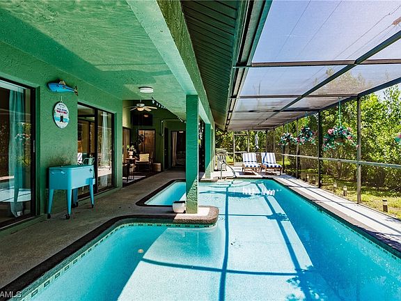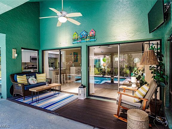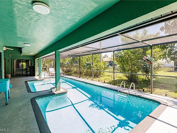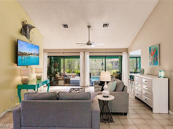 Tropical and move-in ready pool home. Several sliding glass doors gives access to the screened lanai from almost every room in the home, including two of the three bedrooms. Third bedroom sliding glass door will lead you to a separate, side yard sitting area. Split floor plan, updated kitchen with stainless steel appliances, breakfast bar and granite countertops. Interior of the home features tile flooring throughout, vaulted ceilings and skylights providing an abundance of natural light. Large master bedroom boasts a walk-in closet and bath with dual glass bowl sinks, separate shower and a tub/shower combo as well. This home is positioned at the end of a quiet street yet minutes to town. Plenty of room for outdoor entertaining, southern rear facing with a solar, heated pool to enjoy all year long. All utility assessments are paid in full. Property is not located in a flood zone. Flood insurance is not mandatory. Just a few minutes to shopping and dining and only 30 minutes to RSW Ft. Myers Airport. Entire pool cage was rescreened in November 2022. Washer and dryer convey. Furnishings are negotiable-please inquire.
