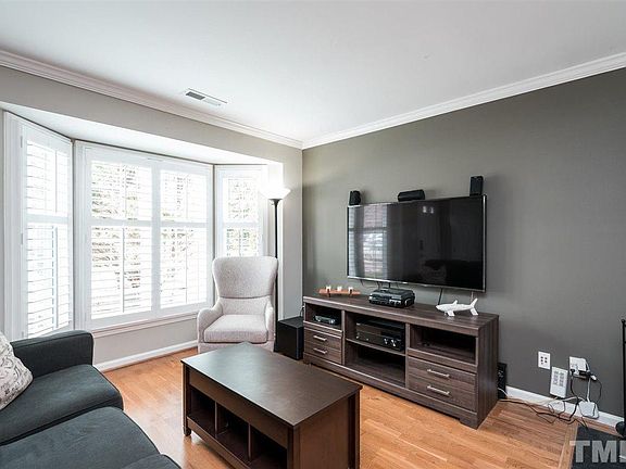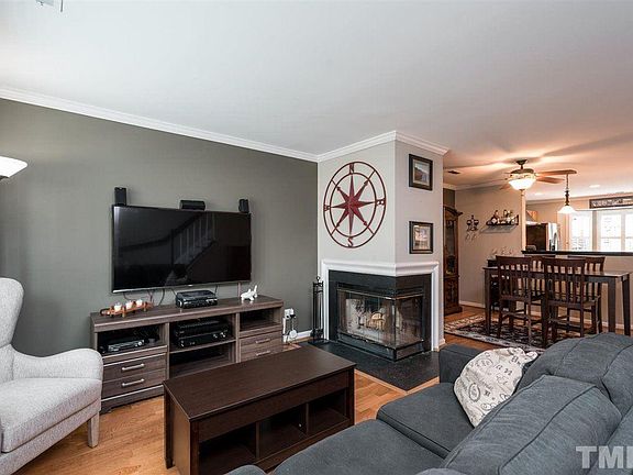 Perfect combination! OUTSTANDING north Cary location, UPGRADED end townhome on a PRIVATE wooded lot. Home is a short drive to RTP, RDU and downtown Raleigh and Cary. Wood flooring through first floor. Wood burning, 2 sided fireplace provides a subtle room divider between dining room/family room. Chef's kitchen with granite counters/breakfast bar, SS appliances and 48" Viking gas range. Two en suite bedrooms with vault ceilings. Custom plantation shutters, updated tile baths, Ring security to stay.