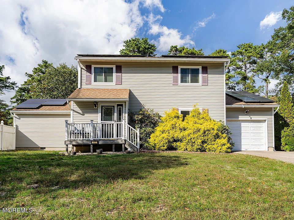 This stunning residence offers an open-concept floor plan with a convenient first-floor master bedroom. Upstairs, you'll find two spacious bedrooms connected by a Jack & Jill bath, perfect for family or guests. Enjoy energy efficiency with owned solar panels included, keeping electric bills low, plus a separate solar-powered in-ground pool heater.
