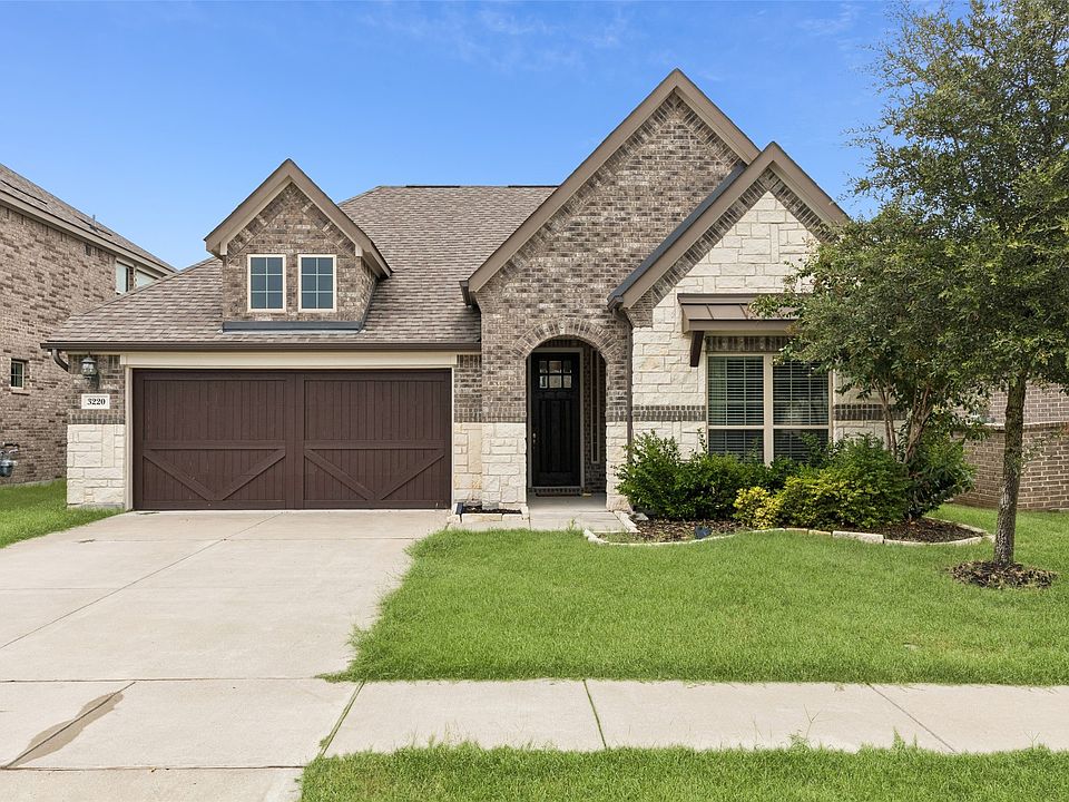 Don’t wait for new construction—this stunning home shows like new! Built with quality and attention to detail, it offers wonderful curb appeal with its brick and stone façade. Located in a resort style community with fun amenities and excellent schools, this home truly has it all. Inside, the open-concept floorplan flows seamlessly, highlighted by a dedicated office with double glass doors—perfect for working from home. A second built-in desk area provides an ideal homework station or extra workspace. The heart of the home is the expansive living, dining, and kitchen combo, bathed in natural light and designed for both comfort and entertaining. The tranquil primary suite is privately tucked away at the back of the home. A light, neutral color palette complements any décor. Enjoy outdoor living on the covered patio, complete with a mounted TV setup, while the wrought iron fence adds style and security. Additional features include a security system with cameras and a two-car attached garage for storage and convenience. This home combines function, comfort, and style—schedule your private showing today and don’t miss the chance to make it yours!