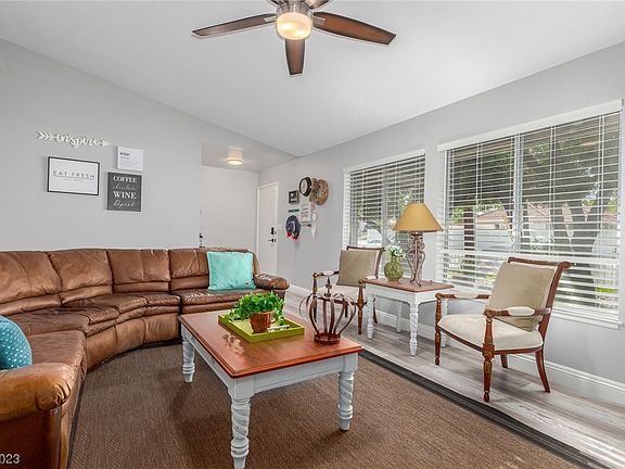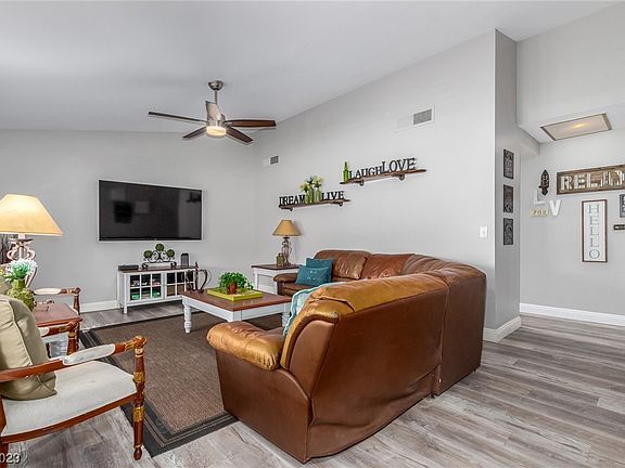 Fall in love with this fabulous 4-bed, 2-bath home in Las Vegas! NO HOA! This property displays a 2-car garage and a private courtyard. The appealing interior showcases wood-look flooring, high vaulted ceilings, window blinds, and a formal living room designed for relaxation and entertainment. The large eat-in kitchen comes with elegant white cabinetry, built-in appliances, butcher block counters, a lovely breakfast bar ideal for a quick morning coffee or casual dining, and sliding glass doors to the back patio. Discover the bright primary bedroom, providing a walk-in closet and a bathroom. Secondary bedrooms have mirrored door closets. For convenience, a washer and dryer are included. The serene backyard is an entertainer's delight, boasting an extended covered patio for outdoor dining and a refreshing pool & spa for leisurely swims, making it a perfect blend of comfort and convenience. Don't just imagine. Just pack your bags and move in!