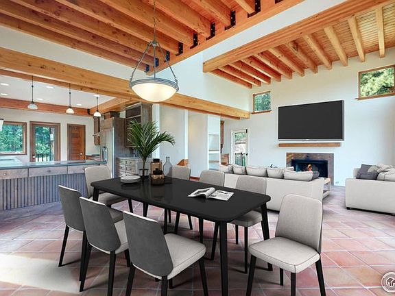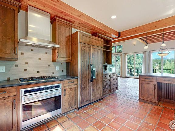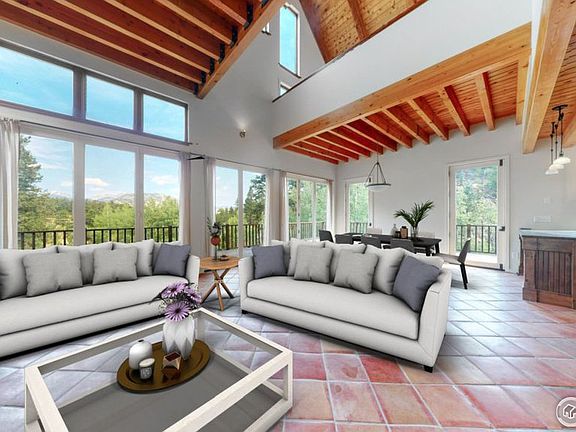 Sanctuary. This property was inspired by a mine in Leadville. This unique architecture is timeless. This secluded 4.84 acres is horse property. Has a loafing shed fenced area for horses with a stream running through it for water. The coach house for guests is separate from the main house. Definitely one of a kind Estes Park property. You have to see this one to appreciate the design and the views. Kitchen has leather granite counter tops. Subzero refrigerator and Wolf appliances. You have to experience this property to appreciate it.