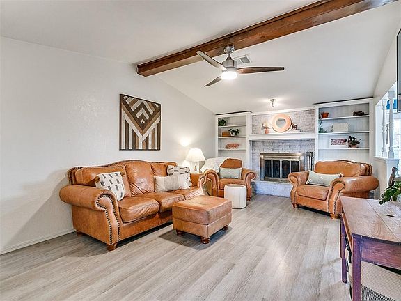 Beautifully updated home in Wingspread with 3 bedrooms and 2 bathrooms located in Moore School District. Walk into this move-in ready house and enjoy the updates of new flooring, fresh paint, and updated light fixtures throughout. In the kitchen you’ll find butcher-block countertops, new sink, subway backsplash, new dishwasher. Both bathrooms have been fully redone with modern vanities, new toilets, and flooring. Master bedroom has full en-suite bathroom and walk-in closet. Step outside and enjoy the patio with triangle sunshade in this large, flat backyard that has full wood privacy fence and shed for storage. **This home also has an in-ground storm shelter in the garage ** Located with easy access to I-40, I-44, I-240, the airport, Tinker and more!