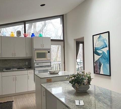 Private and bright contemporary McElroy designed style home in Green Countrie in Newtown Square with 5 bedrooms, 3.5 baths and a 2 car garage. Perched on a hill with beautiful views of trees, this home has about 3,331 sq ft of living space. Enter a large Living Room with beautiful hardwood floor, double sided wood fireplace, windows from floor to ceilings to a Dining room overlooking a panoramic deck. Next to the dining room is the kitchen with granite counters, skylight, breakfast area, fireplace, and door that leads to the 2 car garage. To the left of the entry is a coat closet, large Main bedroom with 2 walk-in closets, Main bathroom with double sinks, separate shower, jacuzzi, skylight. Second bedroom with closet or can be used as an office and a hallway powder room. Beautiful Hardwood floors on this level and high ceilings. Lower Level : Family room with windows from floor to ceiling , 3 bedrooms and 2 full baths, utility room with new water heater and laundry room. This floor has carpeting throughout and sliding doors to a deck. Great location! Few minutes to the Willows, restaurants, shopping, Acme and Whole Foods.