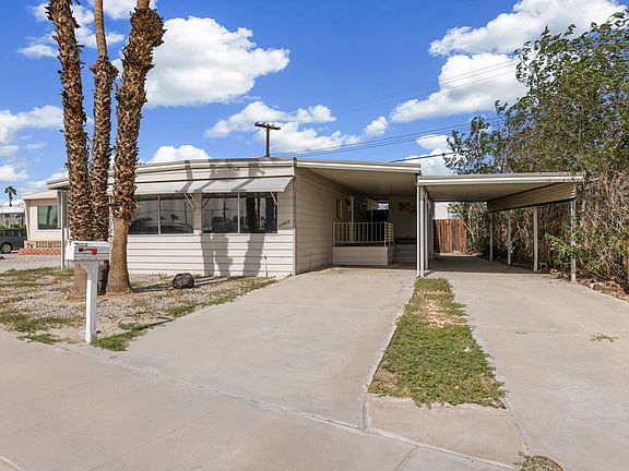Priced to sell! 55+ Tri-Palms Estate Look no further for your fine new home! This vacant little beauty is freshly painted, features tons of charm, light, great views of the San Jacinto, three covered porches, and a nice, private fenced back yard and shed. This roomy 2/2 mobile home features two bonus rooms one off the dining room, one off the guest bedroom for some extra square footage. Open floor plan features a dining room, living room and kitchen with breakfast bar; sliding glass doors out to the backyard from both the master bedroom and the guest bedroom. Two attached aluminum covered carports give you plenty of parking. Washer/Dryer hookups are outside with extra sink. Tri-Palms Estates is a lovely Thousand Palms community where you OWN the land. It features 2 beautiful golf courses and outstanding Mountain Views. Unlimited golfing is FREE for two people. ! LOWEST HOA Fees, ($203/mo) , tennis, pickleball courts, shuffleboard, 2 large swimming pools, two hot tubs and RV storage. Close to freeway access, Costco, Sam's Club, Home Depot, Walmart, Lowes, Theaters and many fine restaurants. Tri Palms is a very active community with Clubhouse, Music Events, and on-site restaurant and bar. People love living in this quiet, friendly community conveniently located near all shopping, casinos, and the finest medical care. Agents, call your buyers! Buyers, call your agents. Vacant, and ready to make your homeowner dreams come true. Financing available for qualified borrower