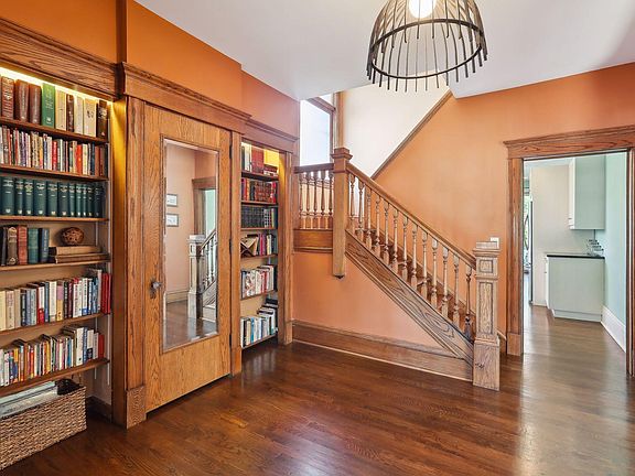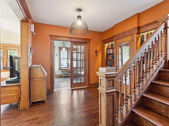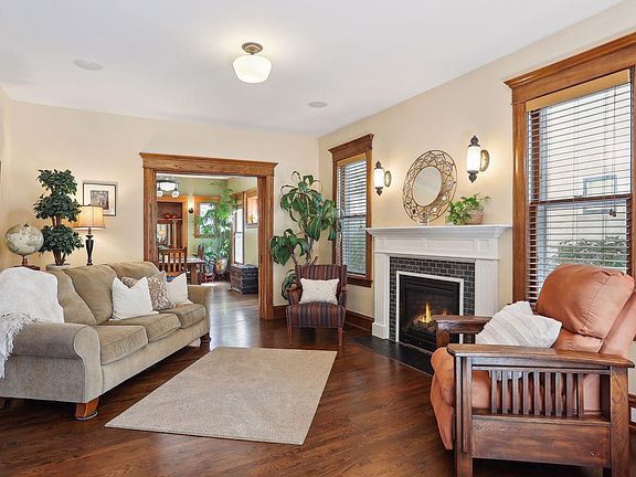 Wonderful 2.5 story home with original charm and important updates! Four season front porch with french doors to the spacious foyer with built-ins and coat closet. Large living room with gas fireplace, oak hardwood, and original woodwork. Sunroom with vaulted ceiling is open to the living room. Formal dining room with original buffet. Remodeled kitchen with granite counters and stainless appliances. Adorable breakfast nook with patio doors to the deck. Third floor primary suite with reading nook and ensuite bathroom. Two second floor bedrooms, including the huge second bedroom with office nook and doors to the upstairs deck. Second floor sunroom previously used as fourth bedroom. Full upstairs bathroom with clawfoot tub. Finished lower level hobby area and laundry room, plus unfinished storage space. Newer garage with separate insulated room, perfect for a workshop or home office. New furnace (2021) & AC (2019). New roof installed prior to closing. Lovely fenced back yard.