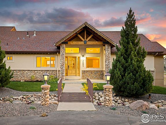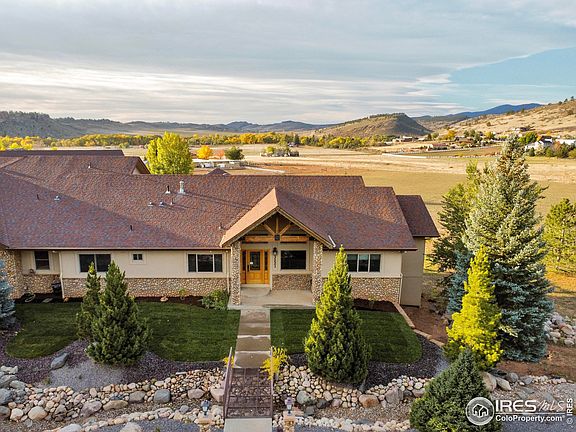 Custom design and panoramic Foothills views redefine luxury in this Loveland home. Exterior stone wainscoting sets the stage for inspired naturalelements within, including gleaming hardwood floors and a natural stone fireplace. An entertainer's layout encompasses a formal dining space and an open living and kitchen area - the latter of which boasts a wraparound breakfast bar, center island and stainless steel appliances. Expansive deck access is granted through French doors, permitting hosts to extend the soiree outside. A main-floor primary suite exemplifies luxe living with stunning views, an en-suite bathroom and a soaking tub encased by natural stone. Each additional room is just as comforting with plush carpet and neutral colors. The walk-out basement affords endless uses with generous space for entertaining. While a guest suite crowns the attached garage, a separate, 7,000 sqft heated building features a workshop space, lift, RV/boat bay and an additional loft for storage.