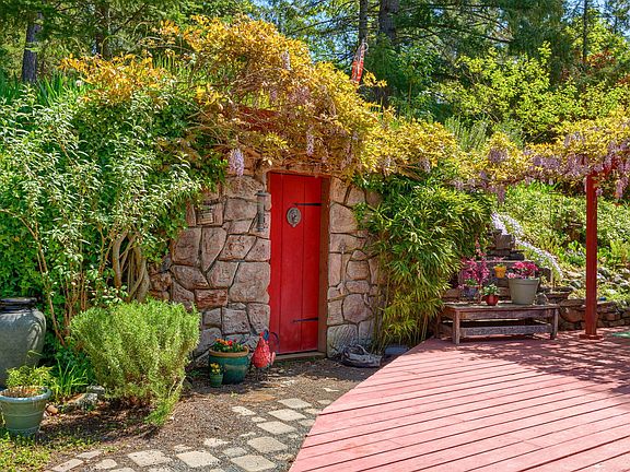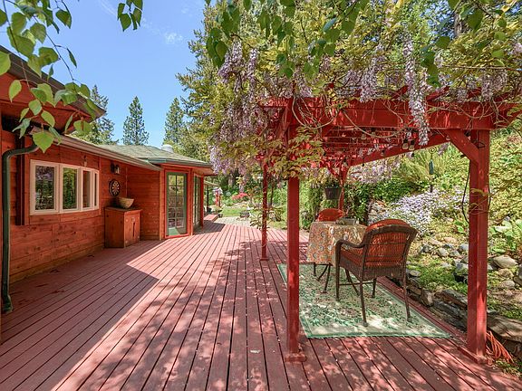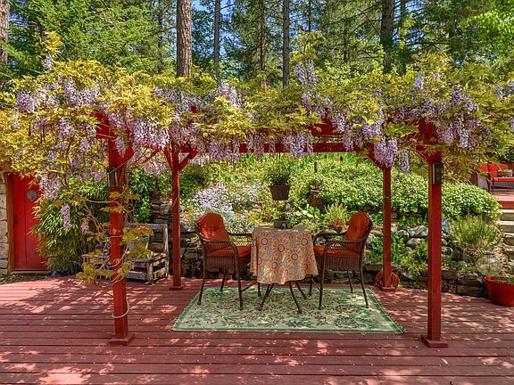 Welcome to your tranquil zen like haven, positioned away from the main road & peacefully perched atop a hill offering peek a boo views and a serene ambiance. The paved driveway meanders by a small orchard to the home. This enchanting 3-bed, 2-bath w/bonus room offers open concept kitchen, living, and dining area. Volcanic rock fireplace adds charm and character to the interior of this lovingly well kept home. French doors exit to the private deck, seamlessly connecting with the surrounding landscape. wine cellar, BBQ area, multiple decks for entertaining or more intimate conversations. Relax under the wisteria-covered pergola, take a dip in the above-ground pool, sit by the fire pit or climb the treehouse and enjoy the view. Fenced garden, orchard, storage barn, large carport, and tool shed also included. Fresh interior paint. Beautiful Cabinetry and builtins. So Much to see. 3 tax lots total 2.49 acres being sold together.