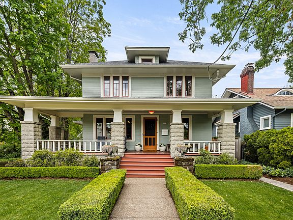 This proud and stately 1915 "Laurelhurst Century Home" anchors the coveted neighborhood's West entrance and sets the architectural tone for the hood. Perfectly proportioned and maintained, this Old Portland Foursquare has preserved craftsman details and recent updates both in and out that create a super cozy, comfortable, modern living experience. A flexible floorplan with sleeping and laundry up, living, formal dining and kitchen on the main, an The re-envisioned backyard creates a lush living compound that takes advantage of the summertime and provides entertainment fun and peaceful respite outdoors. Original craftsman details include impressive stone pillars that shore up the sizable front porch & sun room, vertical sash windows that wrap the house on both levels, custom built-ins, cabinetry & millwork - including box beams, and hardwood floors, high ceilings and sizable rooms. Period-sensitive & tasteful modern recent updates by the current and previous owners, put the bow on top. New Schoolhouse & Rejuvenation lighting, custom new maple built-ins on 2 levels along with former kitchen updates and newly added 36" Wolf gas range compliment the original architecture and provide a welcome modern infusion. Period perfect 2nd floor bathroom & laundry updates require a second take. New AC and dual paned Marvin Windows keep things cozy and comfortable. Drakes 7 Dees transformed the yard with new land & hardscaping, irrigation and lighting. Raised beds provide garden fresh meals and the flexible workshop-playfort combo serves for everyone. A new charger keeps your EVs moving. City living and close to everything including transit, downtown, airport, Hollywood District (MAX/Whole Foods/Trader Joes). Walkable to Restaurant Row on 28th, Laurelhurst - Market, Theater and Park, Migration Brewing, Providore Fine Foods and much more! Come take a look! [Home Energy Score = 4. HES Report at https://rpt.greenbuildingregistry.com/hes/OR10054506]