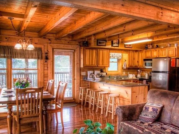 This spacious three level, fully equipped log home is located in a beautiful cabin resort within minutes of the Pigeon Forge parkway with all underground city utilities. Custom features throughout that all other cabins in the resort do not have. Enjoy the open airy design of the livingroom, kitchen with eat at bar, and adjacent dining area, paired with a beautiful honey colored wooden interior. The towering stacked stone corner fireplace invites you to curl up in front of a glowing fire. The upstairs master bedroom offers a king sized bed, and a private corner jacuzzi. The main level Master is handicap accessible with walk in shower, plus second bedroom on main level. The lower level has a game room with wet bar and 2 more bedrooms. You'll notice the 12' x 40' decks.