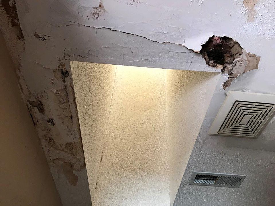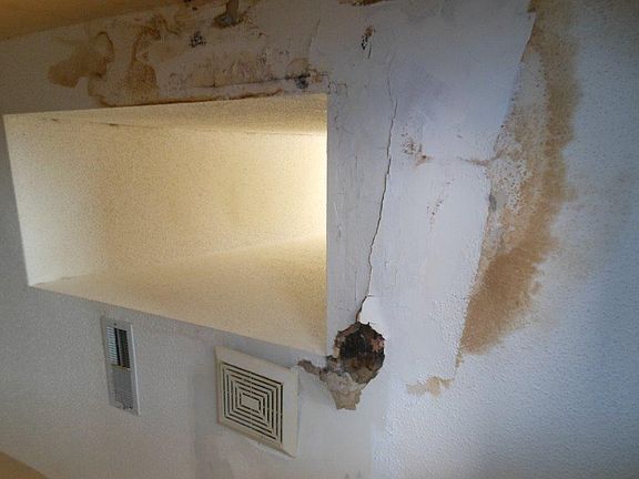 Stop: This unit is not currently habitable. It has been vacant for over a year. It has a serious leak in a skylight that has done a great deal of damage to the upstairs ceiling, insulation, sheetrock, upstairs carpet and flooring, and has continued to the upstairs floor and into the area above the downstairs. The insulation is no doubt been wet repeatedly for many months. The appliances need replacing, as does the heating and air conditioning. It needs painting through- out and new carpets and flooring throughout, including the stairs. There are plumbing needs and more. A back window is broken and has been broken exposing the property to the elements for a long time. The Homeowners Association has refused to fix the skylight on the roof of the building, allowing rain to damage the sheetrock, insulation, flooring, walls, and more. You can see actual pictures of the damaged ceilings below. t