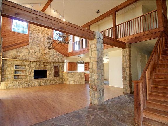Amazing Milsap stone house surrounded by peaceful ranch country. Incredible views from sloping acreage covered with mature oaks. 1/2 mile private driveway from Erwin Rd crosses the Clear Fork Trinity River on its own private bridge leading up to house atop the hill.