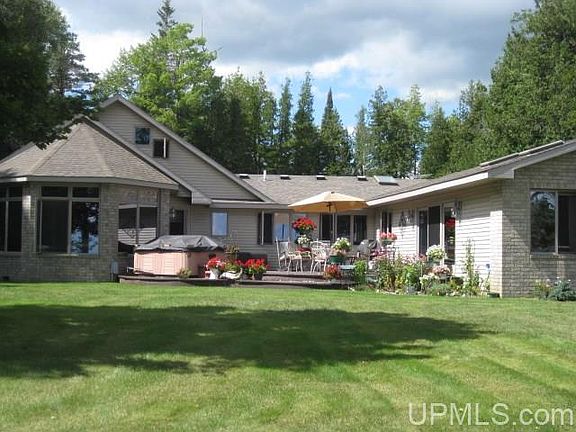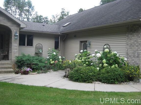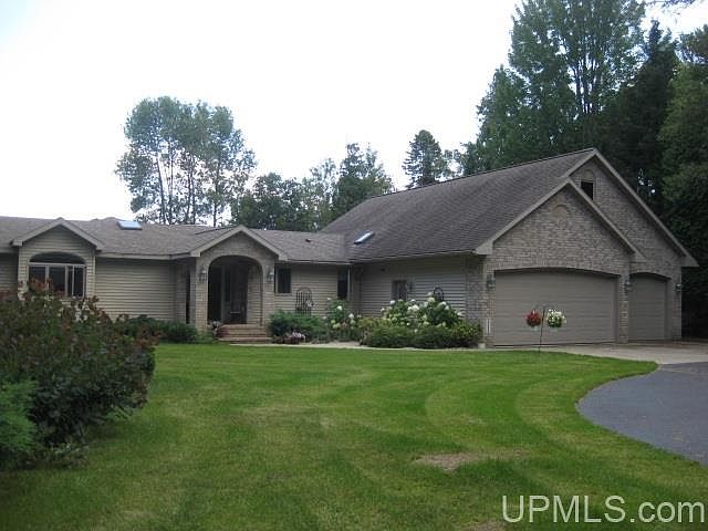 We invite you to view this impressive ranch home with a stunning view of the blue waters of Green Bay. This home with 103' sandy beach is just a short drive south of Escanaba. A gracious entry has arched doorways and upon entrance immediately gives you that awesome view of the lake. Hidden off the road for privacy is this 4 bdrm, 4 bath home with large great room that has gas fireplace and many Anderson windows for the view and 12' patio door to side deck with trex decking. The formal dining area is open to the great room for dinner guests to enjoy the view too. A good size guest bedroom is at one end of the home facing the lake and near a full bath with jetted tub. The master suite is just down the hall and boasts an awesome ensuite with with stone walk-in shower, marble vanity w/double sinks, his/her cherry cabinetry plus linen storage. Enjoy the solarium off mstr bdrm towards the lake and walk out to the deck & hot tub from here. A great place for your morning coffee or just relaxing and reading a good book. Mstr bdrm has Mitsubishi A/C unit which can serve as heat source too. This executive home contains high quality construction along with fine design appointments as seen in the custom cabinetry. Kitchen has maple cabinetry, granite countertops along with cut out view of lake and 2 skylights for natural light. The island has informal seating and kitchen also has a good size pantry unit. The office has many quality buit-ins and a view of the lake too. The upper floor over garage has two add'l bdrms or one to use as family/play room. Near these bdrms is another ¾ bath. Att'd 3 car garage is heated & has central vac to keep cars & garage clean. Near entry from garage is another ¾ bath. 30x50 det'd garage has 25x30 heated workshop with 220 AMP in four areas. Many amenities are included in a home of this size like newer HW boiler, Anderson windows, 12' patio doors, 6 panel doors, granite counter tops, central vac system, Pure Eco laundry system, ceramic in-floor zoned heating, skylights with remotes, beautiful landscaping with underground watering from Artesian well, driveway resealed in 2020 and don't forget that sandy beach! A most inviting home for entertaining family & friends who will be impressed with the view of the lake the minute they enter the foyer.