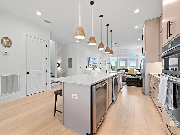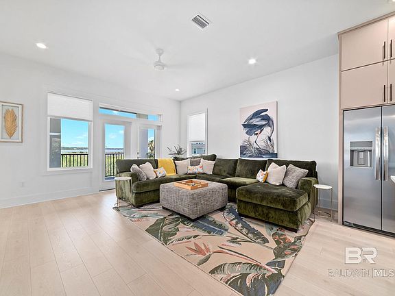 What A View...watch the sunrise over the Little Lagoon in Gulf Shores. This new build beach house has not only incredible lagoon views but also has easy walkable beach and pool access. This gated beachfront community features basketball, tennis/pickle ball court plus a beautiful pool and uncrowded beach. To the west of Laguna Key is Bon Secour National Wildlife Refuge so its untouched and pristine white sand dunes have cool walking trails to explore and also some of the best sunsets you'll ever see. The house has parking underneath and stairs to the first floor. Walking into the main living area there is a large island in the kitchen. To the right of the kitchen is a dining room with access to the south-facing patio. Also in this area is a half bath, laundry room, and bedroom with ensuite bath. This south-facing bedroom has a door to the covered patio as well. To the left of the kitchen, you'll find the den with access to the north-facing covered patio and those beautiful views. This floor also features the downstairs primary bedroom with a larger ensuite bath with a tiled shower, double vanities, and a private water closet. The bedroom has a door to the covered patio. Going upstairs you'll walk right into the den/tv/lounge area with a kitchenette. This area is great for watching movies at the end of a long beach day. The kitchenette has a refrigerator, sink, and microwave. This floor has four bedrooms. Two of them have amazing lagoon views with one being the upstairs Primary and larger ensuite bath. The other lagoon-view bedroom also has an ensuite bath. Both of these bedrooms have doors going out onto the covered patio for those incredible sunsets. The south-facing bedrooms also have private access to the south-facing covered patio for a glimpse of the Gulf of Mexico. Buyer to verify all information during due diligence.