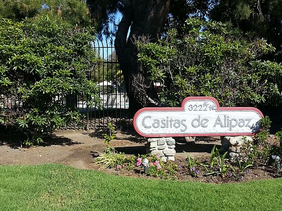 Cozy 1 bedroom/1 bathroom end unit in Casitas De Alipaz with features that include a fireplace, private patio, community swimming pool, detached 1-car garage, walk-in closet, and 785 sq.ft. of living space. HOA covers gas, trash, and water.