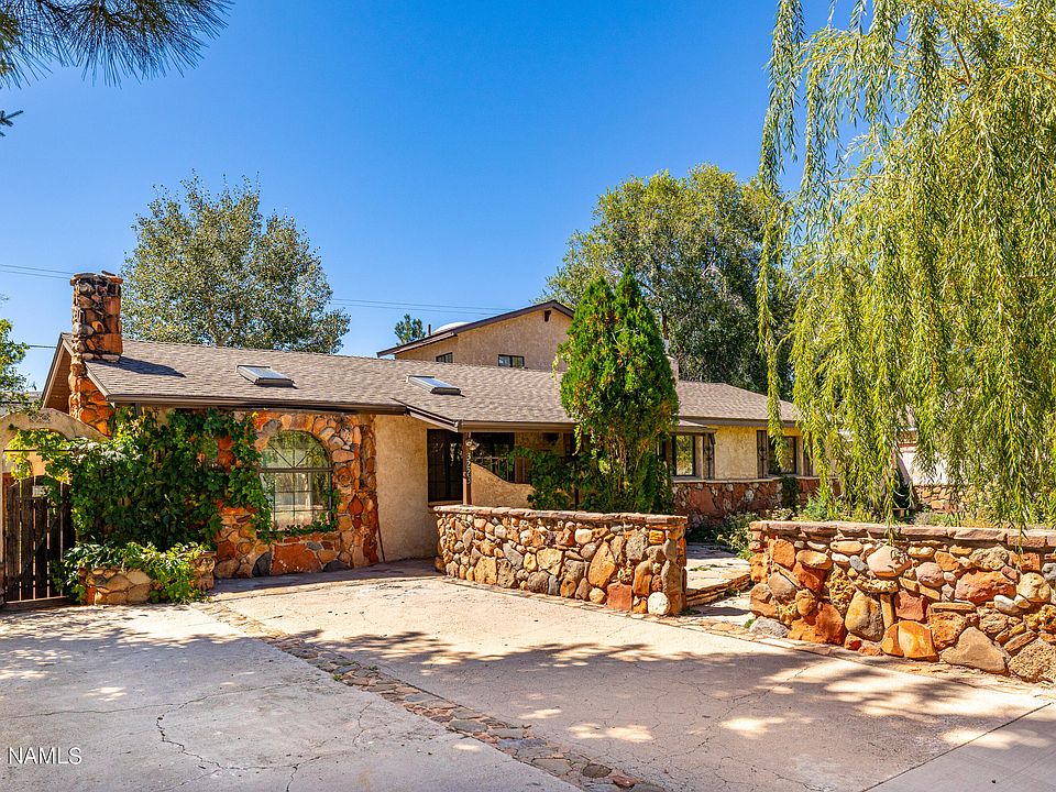 This nicely updated 3-bedroom, 2-bath home is move-in ready and perfectly situated on a quiet side street in East Flagstaff. Just a short walk to schools, shopping, and dining, it offers convenience and comfort. The roof was just completely replaced and there is a fresh coat of interior paint as well. The spacious living room, with custom stone accents and a cozy wood-burning stove, is perfect for those cool Flagstaff nights. An additional fireplace and a gas stove in the primary bedroom add extra warmth and charm. The primary suite also boasts a bonus room that can serve as a 4th bedroom. The kitchen comes fully equipped with a washer, dryer and refrigerator, plus ample storage. Outside, enjoy lush landscaping, patios, and a private side courtyard—ideal for relaxing or entertaining.