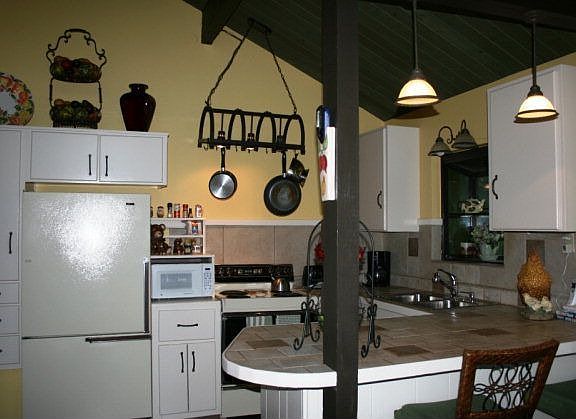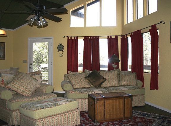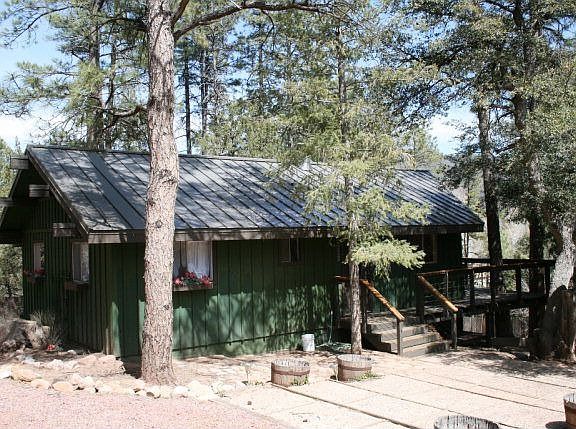 2 bedroom (potential 3rd bedroom), 2 bath with tongue and groove vaulted wood ceiling, woodburning fireplace, window seat surrounded by a built-in entertainment center and plank laminate flooring. The master suite features a spacious bathroom with dual sink vanity, garden tub and separate shower. The spacious recently renovated deck overlooks the fenced back yard with huge stoned firepit and a garden area. You will also enjoy views of the majestic Mogollon Rim. Note the metal roof, exposed concrete front landings and the ample parking on this .41 acre property. Two sheds with electricity and newly added huge carport.