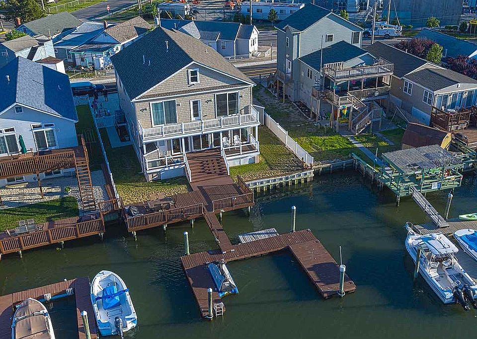 Bayfront Oasis with a 4-boat slip dock! Large custom-built bay front retreat with all the bells and whistles in a nice and quiet section of Wildwood. It has an open floor plan with bamboo flooring throughout except bathrooms which are all tiled. When you enter the main floor there is a 5th bedroom/office on the left and an extra wide stairway to the second floor. The great room combines the TV viewing area, dining room which fits a table for 10 plus guests, and living room with 4 sliders overlooking the boats and waterway (leads to the intercostal). Gourmet kitchen with cream cabinets, granite counters and island, under-mount large/deep sink, tiled backsplash, pot filler over the range, and stainless steel appliances: Blue Star gas range with 4 burners and a center grill, double wall oven, dishwasher and refrigerator. Powder room has a separate entrance off of the deck (in addition to normal entrance from great room) for use by those with wet feet/bathing suits to eliminate water tracking through the house. Second floor has 4 large bedrooms and 3 full bathrooms. The master suite has a large walk-in closet with custom closet organizer and large slider to a deck. The master bathroom has double sinks, large tiled shower and plenty of cabinet storage plus a linen closet. The hallway has a glass door to the deck and pull-down stairs to a large floored attic which can be used for extra storage - you can stand up in the attic. Additional interior upgrades includes lighting & fixtures, dual-zoned heating (gas) and air-conditioning (2 separate units), and hurricane windows. There is an attached 1-1/2 car garage with pull-down stairs , a nice sized fenced-in yard with a storage shed, 2 decks (in addition to the 2nd floor deck) and a 4 boat slip dock. Home is on a protected waterway (across from West Wildwood) and has less risk of dock damage as compared to being on the open bay. The home location is near the electric company which has one of the highest elevations in the Wildwoods -- protects the property when many areas of the Wildwoods flood with heavy rains and/or high tides. Constructed with quality, comfort & safety in mind.
