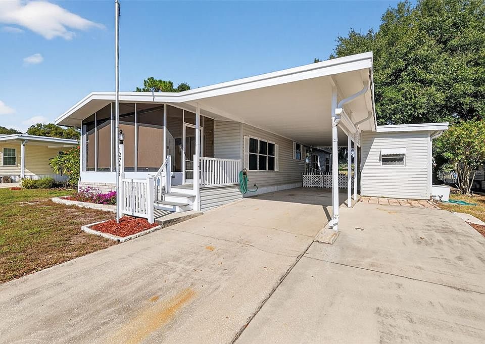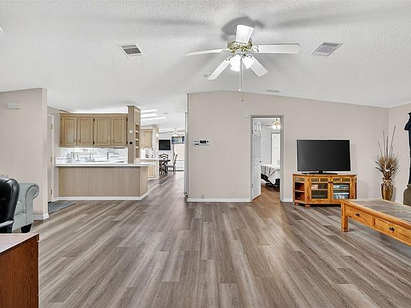 Situated in the Fox Run 55+ community, this 3-bedroom 2-bath home with 1,568 SF of interior living area offers a very functional and flexible split floor plan, all centered around its great room, which separates the primary suite from the second and third bedrooms, enhancing your privacy. Newly installed vinyl plank flooring, volume ceilings, skylights, and plenty of windows add to the open feel of the home. The formal dining area located across from the great room can be used for an additional living area or a hobby/office space. The kitchen, with its ample cabinets, large pantry, and counter space, flows seamlessly into the front dining area, offering great views of the outdoors through the front screened porch. The oversize driveway has plenty of room for company parking as well as your golf cart. At the back of the carport, you can relax in the shaded patio area while you watch your pet enjoy the outside in the fenced and private backyard. Fox Run 55+ community offers a busy social calendar centered around its clubhouse and two pools. Whether you enjoy walks in the neighborhood or on the boardwalk, or fishing from the dock, with access to the "Harris Chain of Lakes" from its marina and boat ramp, you can also enjoy a day on the water fishing or cruising. Call today to schedule your private showing, so you too can enjoy the Fox Run Lifestyle.