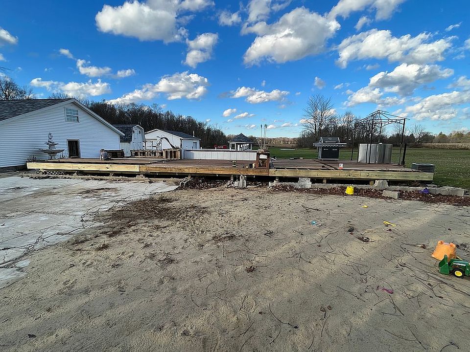 No home due to structure fire, home was removed and filled with sand. 400amp service installed in 2023 to 3 car garage and power restored to pole barn, all new electric throughout property. Water restored to 3 car garage.