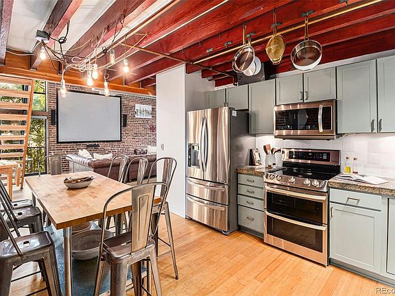 Looking for a one-of-a-kind, trendy loft in Denver's vibrant RiNo district? Look no further! This stunning unit is located right across from Improper City, surrounded by some of the best restaurants, bars, and shops the city has to offer. Situated in the highly sought-after Fire Clay Lofts, this home boasts soaring ceilings, exposed brick walls, and luxurious Hunter Douglas motorized shades for the perfect balance of privacy and natural light. The stylish kitchen features striking green cabinets, brass hardware, a beautiful backsplash, stainless steel appliances, hanging pot hooks, and ample wine storage ideal for food lovers and entertainers alike. As night falls, the loft's charm comes to life with two elegant chandeliers illuminating the spacious living areas. With one covered parking space included and the option to purchase a second, this home offers both style and convenience, making it a standout choice for those seeking modern urban living at its finest.