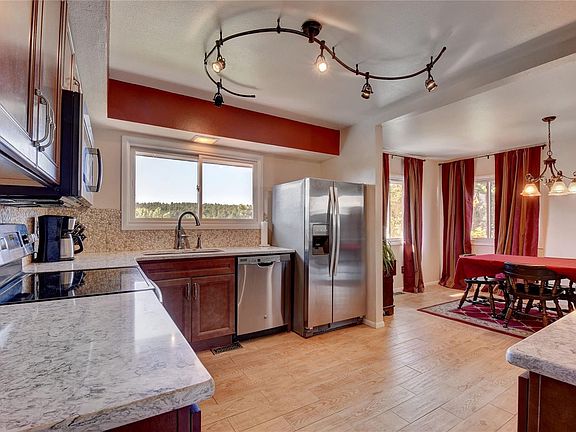 Welcome to this spacious home located in the heart of Evergreen on a sunny lot with public water & sewer. This two-story home offers space for everyone and has plenty of storage. The remodeled kitchen has quartz counter-tops, maple cabinetry, stainless appliances, and is open to the dining and living areas. The living room has a wood burning fireplace and offers access to a huge deck. Three bedrooms and two baths complete the main level. The upper level presents a Master Suite with a four-piece bath and two additional bedrooms with a full bath. The expansive lower level is perfect for entertaining with a huge family room, wet bar, wood burning fireplace and and a 7th bedroom and bath. Minutes to schools, shopping, open space and I-70. Huge parking area!