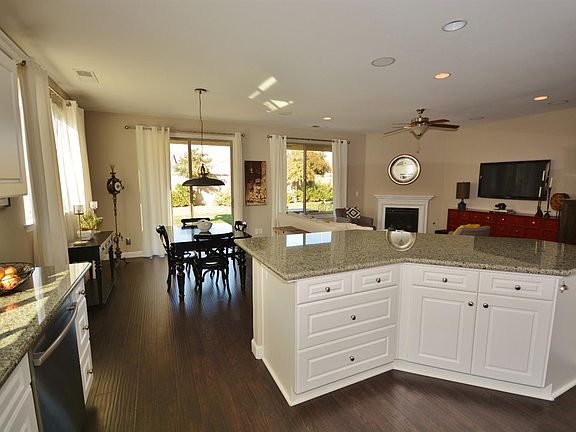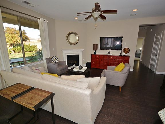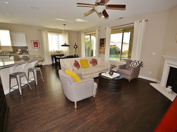 OUTSTANDING Opportunity ! This model like home is exquisite. As you enter through the lovely gated courtyard you find an open floor plan with beautiful laminate floors, high ceilings and designer touches throughout. The kitchen features granite countertops with a full granite back splash, beautiful solid wood soft close cabinetry, stainless steel appliances, breakfast bar, pantry and is open to the Great Room with fireplace and views of the lovely backyard. Master suite is large with Master bath featuring soft close cabinetry separate tub, separate shower, dual sinks and a walk in closet. There are 2 additional bedrooms and bath. The backyard has a covered patio, with extended stamped concrete with electrical outlets and a nice side area. Inside laundry with nice wood cabinetry, keyless garage door entry and plenty of storage accompany this home!