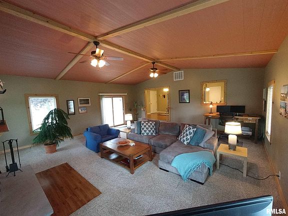 Enchanting 3 acres of fruit trees, grape vines, berry bushes and pond. Enjoy the view of the well-stocked pond while taking in the wildlife. You will love the 24 x 24 family room with cathedral ceilings and wood-burning fireplace for those cool winter evenings. You'll find open-concept dining, an island in the kitchen with a walk-in pantry, that overlooks the family room. Master Suite has walk-in closets, newly remodeled master bath with Jacuzzi tub/walk-in shower. The extra dining area could be transformed into a 3rd bedroom or an office. If a 2 car garage is not enough, the property includes a 24 x 40 detached garage with heating, cooling, running water, 220v and 12 x 14 lean-to, in addition, 2 additional storage sheds with electric service. The detached garage has another bonus feature-a professional car lift. There is a separate septic and power source if you have an RV. This property is centrally located only 1 mile from Rt.161 but in a beautiful, private setting for you to enjoy.