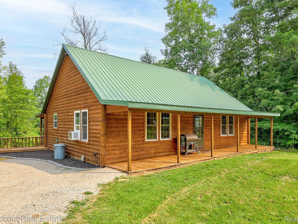 This early 2000s, 1,300 sq ft log cabin will enchant you from its simple, inviting features to its location, 5 minutes from M-15 and Otter Lake, and surrounded by 2,700 acres of state land. The exterior was recently stained (July2023) and has sweeping wooded views from covered porch and deck, with wildlife abundant and Millington Creek running through the outskirts of the property. The house features soaring vaulted ceilings, 1-2 potential bedrooms, plus a 30x15 loft, gas stone fireplace in living room, hickory floors and remodeled bath (2019). The lot has been recently leveled and fill dirt brought in for a potential garage. Partial basement for easy access to utilities and for safety. Don't miss the opportunity to own a home with the "up north getaway" feel every day.