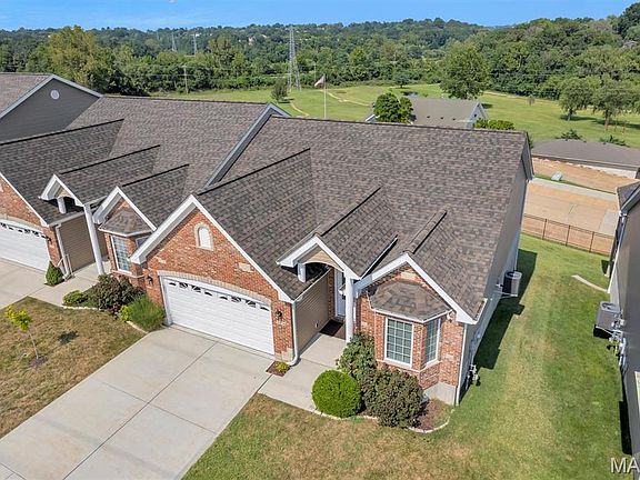 Meet Miss Palmer! This stunning villa blends style, comfort & convenience with over 1,500 sq ft on one easy level. Striking curb appeal with red brick & stone, 3 peaks, & inlaid address numbers set the tone. Inside, soaring vaulted ceilings, wide-open spaces & abundant natural light create an inviting atmosphere. The kitchen is a chef’s delight with quartz countertops, stainless appliances (refrigerator incl.), pantry, crown-molded cabinetry, trash slider, breakfast bar & bay window. The flexible living area with gas fireplace adapts to your lifestyle—home office, dining, or cozy retreat—while a rear deck overlooks Pomme Creek Park’s scenic trails, the perfect backdrop for morning coffee or evening wine. The primary suite impresses with a large walk-in closet & spacious shower featuring a seat. A 2nd bedroom with bay window, full guest bath, laundry room (W/D incl.) & bonus coat closet round out the main floor. The expansive walkout lower level with rough-in bath & egress offers endless potential for a 3rd bedroom or family room. Upgrades include engineered hardwood floors, recessed lighting, window sills, irrigation & a brick mailbox. Enjoy low-maintenance living with a friendly HOA covering lawn care, snow removal, trash & some exterior maintenance—all in the desirable Arnold community known for its rolling hills, parks, amenities, & easy St. Louis access. Only 5 years young!