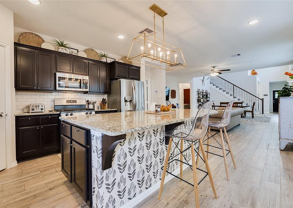 LIKE NEW!! FIVE bedrooms (or 4 bedrooms + a work-from-home study, if that's what you need!), 3 full baths, a HUGE game room & open concept floorplan make this 2018 built Highland Home one you won't want to miss! Wood-like tile flooring flows throughout, custom shelving in dining room, fabulous lighting -- the designer touches are endless in this beauty. Kitchen is equipped with subway tile backsplash, adorable window seat, gas range, spacious pantry and a perfect view to the backyard to watch the kids or pets play! Kitchen island is a perfect centerpiece w/ a gorgeous custom light, wallpaper accent and stylish granite. Primary suite is complete w/ charming window seat, huge closet, oversized soaking tub, framed mirror and dual sinks! Primary suite AND one other bedroom on first floor; 3 more bedrooms upstairs with fabulous game room! The backyard has great space for play/ hanging out under the covered back patio. It won't last long - see this stunner today!